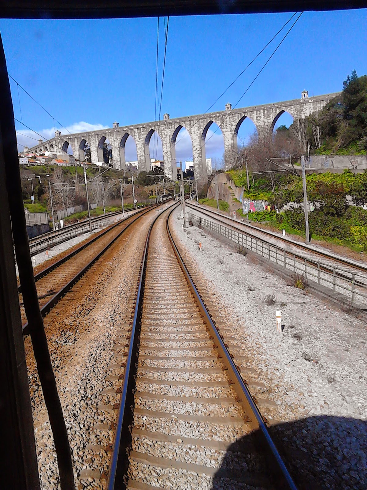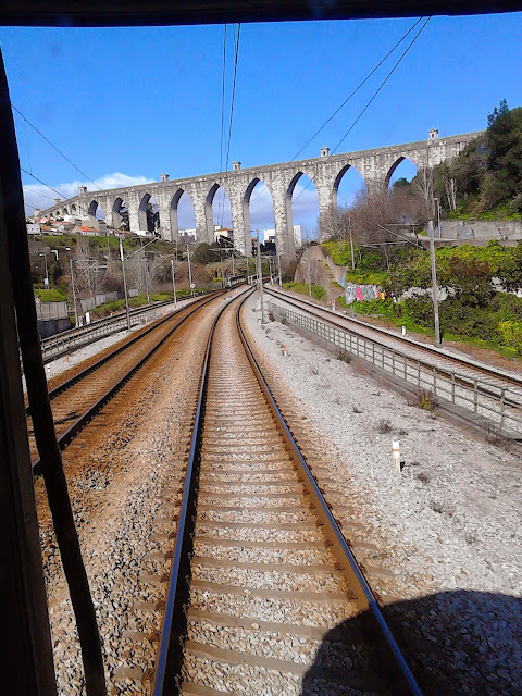 An unusual view of the Aqueduct from the rear door of the rear carriage of a cp.pt Lisbon Gare Oriente to Faro, Algarve Intercidade sourh-bound train taken yesterday.